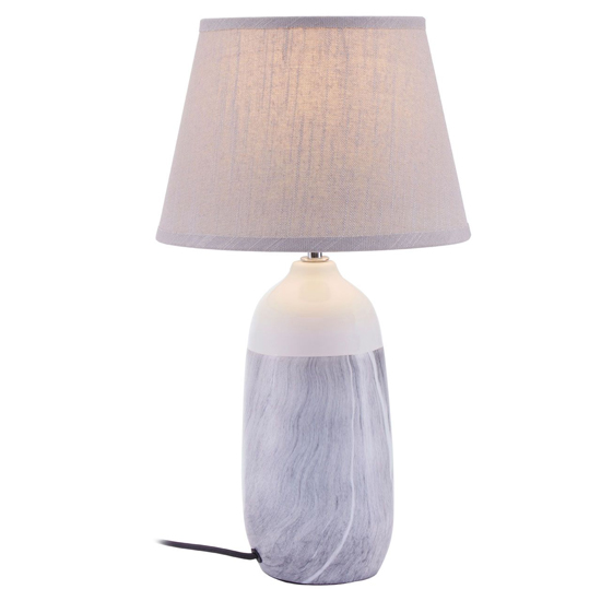 The marble effect detail on the Welmon table lamp gives it an elegant, classical look. FEATURES : Material : Ceramic, TC Material (85% Polyester, 15% Cotton) Finish : Beige, Dark Grey Made from durable ceramic, the Welmon table lamp’s base is a contrasting white and dark grey marble effect The white fabric shade contributes to the lamp’s two-tone look, making it an ideal way to add accent to a monochrome design setting Slightly tapered, the shade will produce a warm glow when the lamp is in use, making it perfect for adding a little ambient lighting in the evening Available at an affordable price Images shown are for illustration purpose only DIMENSIONS : Height : 46cm Width : 25cm Depth : 25cm
